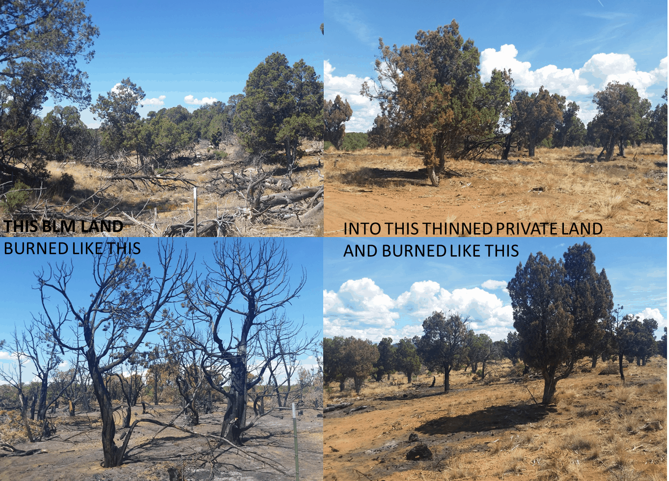A local engine boss elaborated on why the previous week’s fire didn’t grow beyond 3 acres. He said that the BLM land had not been treated in the area where the lightning fire took off in the piñon/ juniper on that red flag day, but it quickly reached a 160-acre parcel owned by a retired park service chap who had drastically thinned his forest. The fire could only throw spots onto his land. The BLM crew went out to take some photos for me. Photos like these help me show the benefits of fuels work.